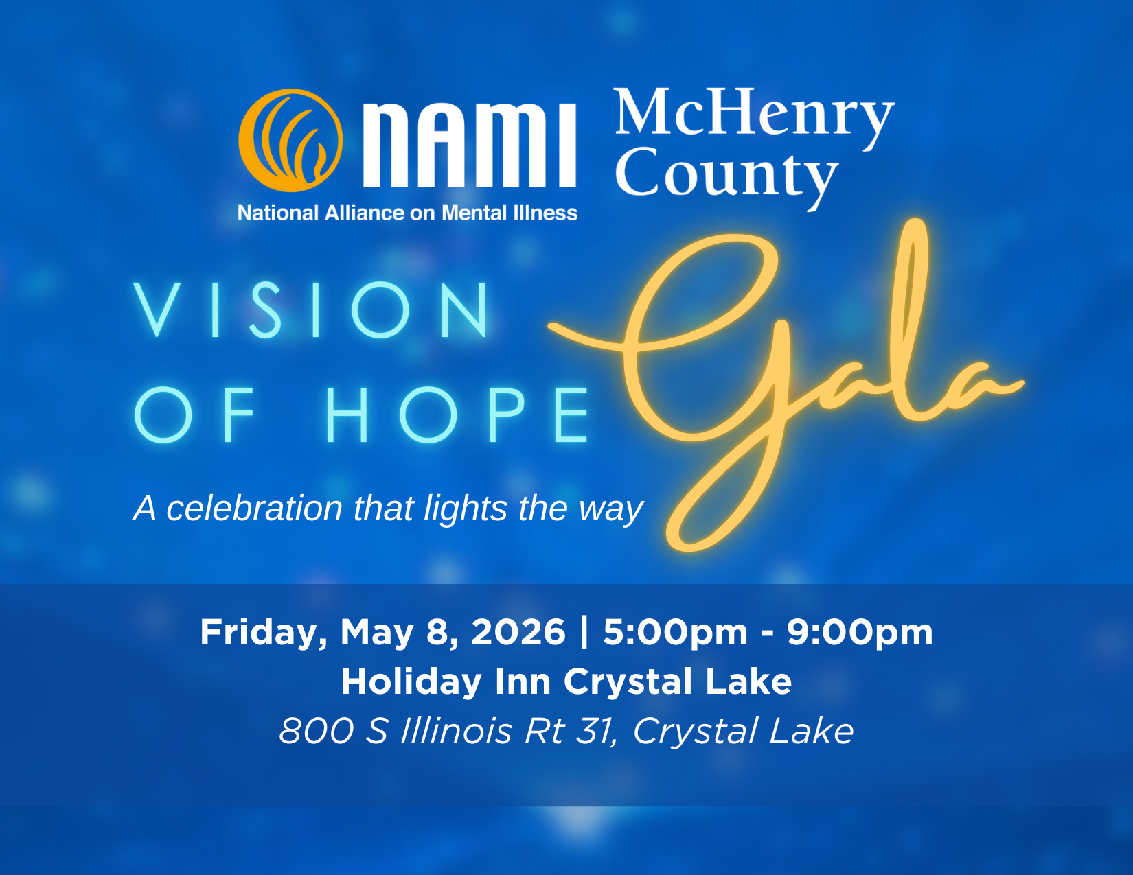 You’re invited to NAMI McHenry County’s annual Vision of Hope Gala, an event to raise awareness and funds for free mental health services in our community. The evening includes appetizers, dinner, cash bar, music, a silent auction, and an inspirational program celebrating our 2026 Vision of Hope awardees.